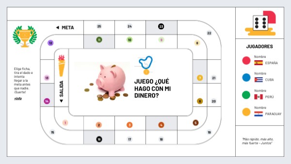 Pueden jugar de 2 a 4 jugadores/as. Cada jugador/a debe elegir una ficha (amarilla, azul, roja o verde) y lanzar el dado. El jugador/a que obtenga el número más alto será el que comience la partida. Para jugar cada participante debe lanzar el dado y mover su ficha hasta la casilla que corresponda. En cada casilla debe haber una pregunta sobre “Entidades financieras”. Si responde correctamente puede seguir avanzando, si no lo hace pasa el turno al siguiente jugador. En el tablero hay además 6 casillas especiales (con el número en negro) en las que el jugador/a pierde un turno sin jugar. Ganará el jugador/a que llegue en primer lugar a la meta.