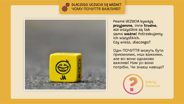 Pewne UCZUCIA bywają przyjemne, inne trudne, ale wszystkie są tak samo ważne! Potrzebujemy ich wszystkich. Czy wiesz, dlaczego? Одні ПОЧУТТЯ можуть бути приємними, інші важкими, але всі вони однаково важливі! Нам усі вони потрібні. Чи знаєш навіщо?