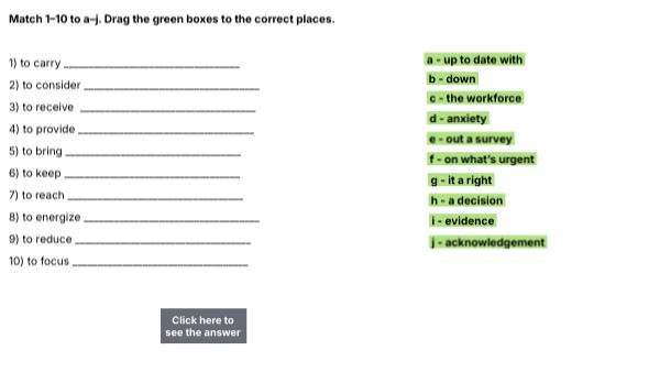 Match 1–10 to a–j. Drag the green boxes to the correct places. 1) to carry ___________________________________ 2) to consider ___________________________________ 3) to receive ___________________________________ 4) to provide ___________________________________ 5) to bring ___________________________________ 6) to keep ___________________________________ 7) to reach ___________________________________ 8) to energize ___________________________________ 9) to reduce ___________________________________ 10) to focus ___________________________________