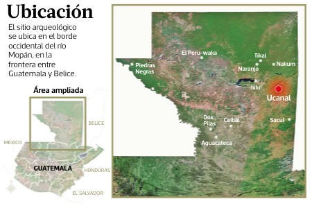 El sitio arqueológico se ubica en el borde occidental del río Mopán, en la frontera entre Guatemala y Belice.