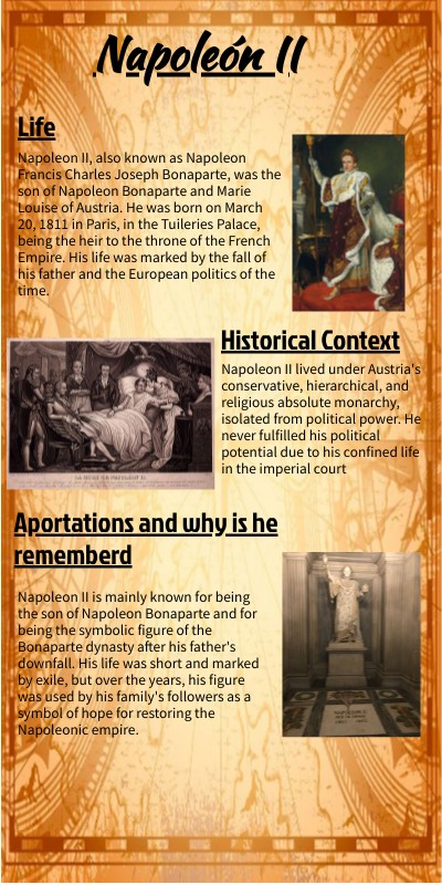 Napoleon II is mainly known for being the son of Napoleon Bonaparte and for being the symbolic figure of the Bonaparte dynasty after his father's downfall. His life was short and marked by exile, but over the years, his figure was used by his family's followers as a symbol of hope for restoring the Napoleonic empire.