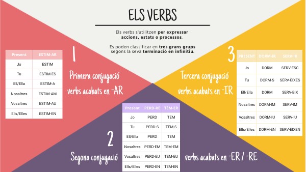 Els verbs s'utilitzen per expressar accions, estats o processos. Es poden classificar en tres grans grups segons la seva terminació en infinitiu.