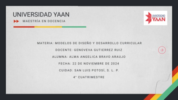 MATERIA: MODELOS DE DISEÑO Y DESARROLLO CURRICULAR DOCENTE: GENOVEVA GUTIERREZ RUIZ ALUMNA: ALMA ANGELICA BRAVO ARAUJO FECHA: 22 DE NOVIEMBRE DE 2024 CUIDAD: SAN LUIS POTOSÍ, S. L. P. 4° CUATRIMESTRE
