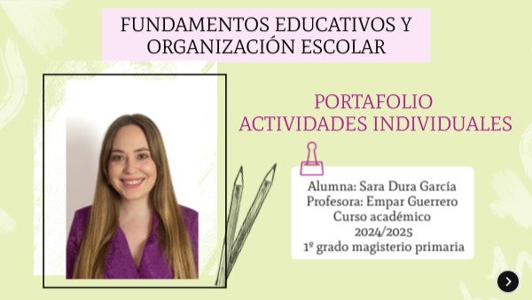 En este portafolio se refleja el trabajo que he realizado en la asignatura Fundamentos Educativos y Organización Escolar, correspondiente al primer curso del Grado en Magisterio de Educación Primaria en la UCV. Este portafolio tiene como objetivo mostrar el aprendizaje que se ha alcanzado a lo largo del cuatrimestre mediante diferentes actividades y reflexiones. Las actividades que se incluyen en este trabajo contribuyen al proceso formativo para prepararme para entender los fundamentos de la educación y la organización, desarrollando habilidades y conocimientos para el futuro profesional. Este trabajo se estructura en las diferentes actividades para fomentar una comprensión integral de la educación desde una perspectiva teórica y práctica, construyendo una visión crítica y reflexiva sobre el sistema educativo. El portafolio está organizado en diferentes apartados que reflejan los aspectos trabajados en la asignatura. Para la elaboración de este portafolio, se han empleado recursos como materiales bibliográficos, análisis críticos y reflexiones personales, siguiendo una metodología que combina teoría y práctica. Con esta estructura, el documento busca ofrecer una visión clara y organizada del trabajo realizado, resaltando el aprendizaje y las habilidades adquiridas en el marco de la asignatura.