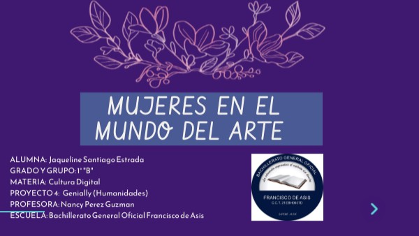 ALUMNA: Jaqueline Santiago Estrada GRADO Y GRUPO: 1° "B" MATERIA: Cultura DigitalPROYECTO 4: Genially (Humanidades) PROFESORA: Nancy Perez Guzman ESCUELA: Bachillerato General Oficial Francisco de Asis