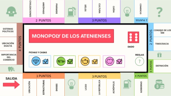 Cada jugador/a debe elegir un color: azul, verde, amarillo o rosa. Así obtiene una ficha para marcar su posición y 10 casas para indicar las propiedades que adquiere a lo largo del juego. Cada jugador debe poner la ficha de su color y colocarla en la casilla de salida. Para empezar a jugar, pincha sobre el dado y mueve tu ficha hasta la casilla que corresponda. En cada casilla debe haber una pregunta y varias opciones. Si la aciertas, ganas los puntos de dicha casilla y debes de poner una casita de tu color. Ganará aquel jugador/a que tenga el mayor número de puntos. En caso de que algún jugador caiga en una casilla que tu tenga alguna de tus propiedades, pierde 2 puntos.