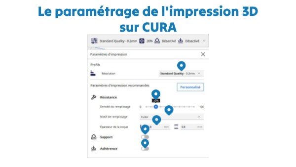 La résolution agit sur l'épaisseur de chaque couche et sur l'aspect final de l'objet imprimé.Le paramètre "Qualité standard" remplit très bien son rôle pour les pièces courantes. À noter que le temps d'impression augmente en même temps que la qualité car la machine doit déposer davantage de couches si elles sont plus fines.