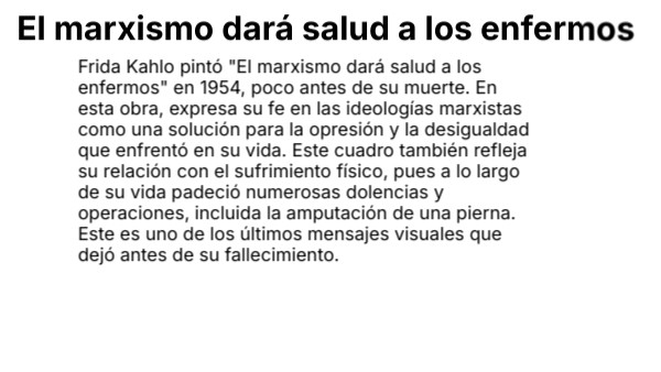 Frida Kahlo pintó "El marxismo dará salud a los enfermos" en 1954, poco antes de su muerte. En esta obra, expresa su fe en las ideologías marxistas como una solución para la opresión y la desigualdad que enfrentó en su vida. Este cuadro también refleja su relación con el sufrimiento físico, pues a lo largo de su vida padeció numerosas dolencias y operaciones, incluida la amputación de una pierna. Este es uno de los últimos mensajes visuales que dejó antes de su fallecimiento.