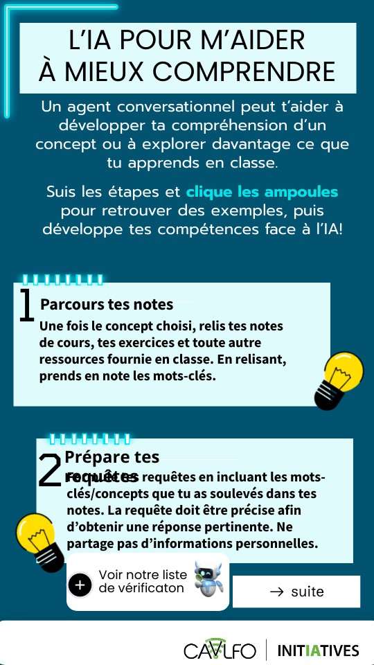 Un agent conversationnel peut t’aider àdévelopper ta compréhension d’unconcept ou à explorer davantage ce quetu apprends en classe. Suis les étapes et clique les ampoulespour retrouver des exemples, puisdéveloppe tes compétences face à l’IA!