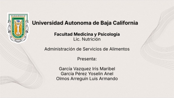 Facultad Medicina y Psicología Lic. Nutrición Administración de Servicios de Alimentos Presenta: García Vazquez Iris Maribel García Pérez Yoselin Anel Olmos Arreguín Luis Armando