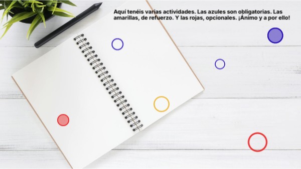 Aquí tenéis varias actividades. Las azules son obligatorias. Las amarillas, de refuerzo. Y las rojas, opcionales. ¡Ánimo y a por ello!