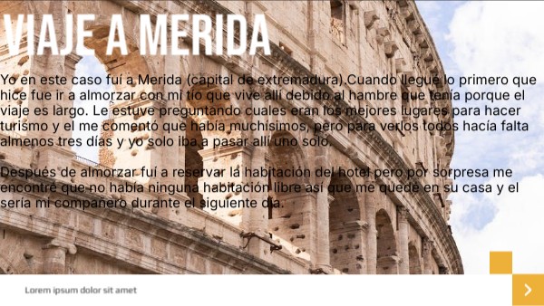 Yo en este caso fuí a Merida (capital de extremadura).Cuando llegué lo primero que hice fue ir a almorzar con mi tío que vive allí debido al hambre que tenía porque el viaje es largo. Le estuve preguntando cuales eran los mejores lugares para hacer turismo y el me comentó que había muchísimos, pero para verlos todos hacía falta almenos tres días y yo solo iba a pasar allí uno solo. Después de almorzar fuí a reservar la habitación del hotel pero por sorpresa me encontré que no había ninguna habitación libre así que me quedé en su casa y el sería mi compañero durante el siguiente día.
