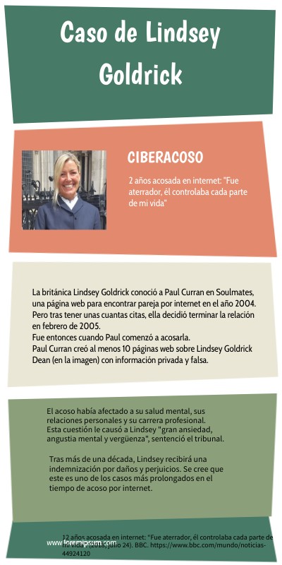 La británica Lindsey Goldrick conoció a Paul Curran en Soulmates, una página web para encontrar pareja por internet en el año 2004. Pero tras tener unas cuantas citas, ella decidió terminar la relación en febrero de 2005. Fue entonces cuando Paul comenzó a acosarla. Paul Curran creó al menos 10 páginas web sobre Lindsey Goldrick Dean (en la imagen) con información privada y falsa.