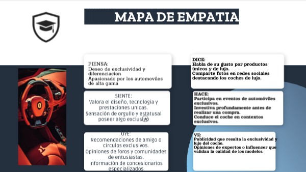 HACE:Participa en eventos de automóviles exclusivos. Investiva profundamente antes de realizar una compra. Conduce el coche en contextos exclusivos.