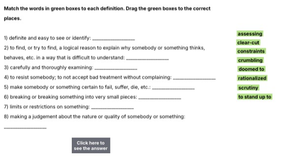 1 clear-cut - 2 rationalized - 3 scrutiny 4 to stand up to - 5 doomed to - 6 crumbling 7 constraints - 8 assessing