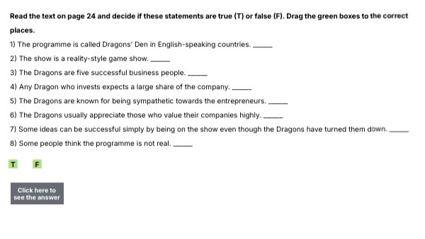 Read the text on page 24 and decide if these statements are true (T) or false (F). Drag the green boxes to the correct places. 1) The programme is called Dragons’ Den in English-speaking countries. ______ 2) The show is a reality-style game show. ______ 3) The Dragons are five successful business people. ______ 4) Any Dragon who invests expects a large share of the company. ______ 5) The Dragons are known for being sympathetic towards the entrepreneurs. ______ 6) The Dragons usually appreciate those who value their companies highly. ______ 7) Some ideas can be successful simply by being on the show even though the Dragons have turned them down. ______ 8) Some people think the programme is not real. ______