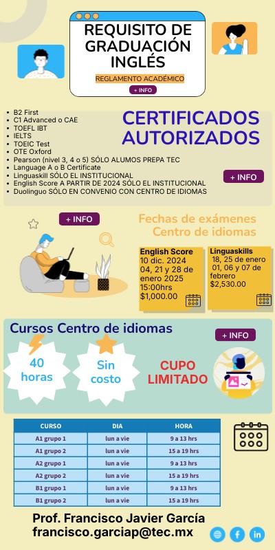 Artículo 6.1 Para obtener un título profesional en el Tecnológico de Monterrey se requiere: 7. Haber demostrado un nivel de dominio B2 del idioma inglés referenciado al Marco Común Europeo de Referencia (MCER) en alguno de los exámenes autorizados por la Vicerrectoría Académica.
