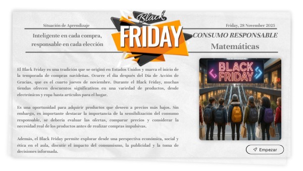 El Black Friday es una tradición que se originó en Estados Unidos y marca el inicio de la temporada de compras navideñas. Ocurre el día después del Día de Acción de Gracias, que es el cuarto jueves de noviembre. Durante el Black Friday, muchas tiendas ofrecen descuentos significativos en una variedad de productos, desde electrónicos y ropa hasta artículos para el hogar. Es una oportunidad para adquirir productos que deseen a precios más bajos. Sin embargo, es importante destacar la importancia de la sensibilización del consumo responsable, se debería evaluar las ofertas, comparar precios y considerar la necesidad real de los productos antes de realizar compras impulsivas. Además, el Black Friday permite explorar desde una perspectiva económica, social y ética en el aula, discutir el impacto del consumismo, la publicidad y la toma de decisiones informada.