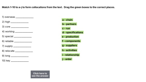 Match 1–10 to a–j to form collocations from the text. Drag the green boxes to the correct places. 1) overseas ________________ 2) high ________________ 3) core ________________ 4) working ________________ 5) special ________________ 6) reliable ________________ 7) supply ________________ 8) relocate ________________ 9) long ________________ 10) key ________________