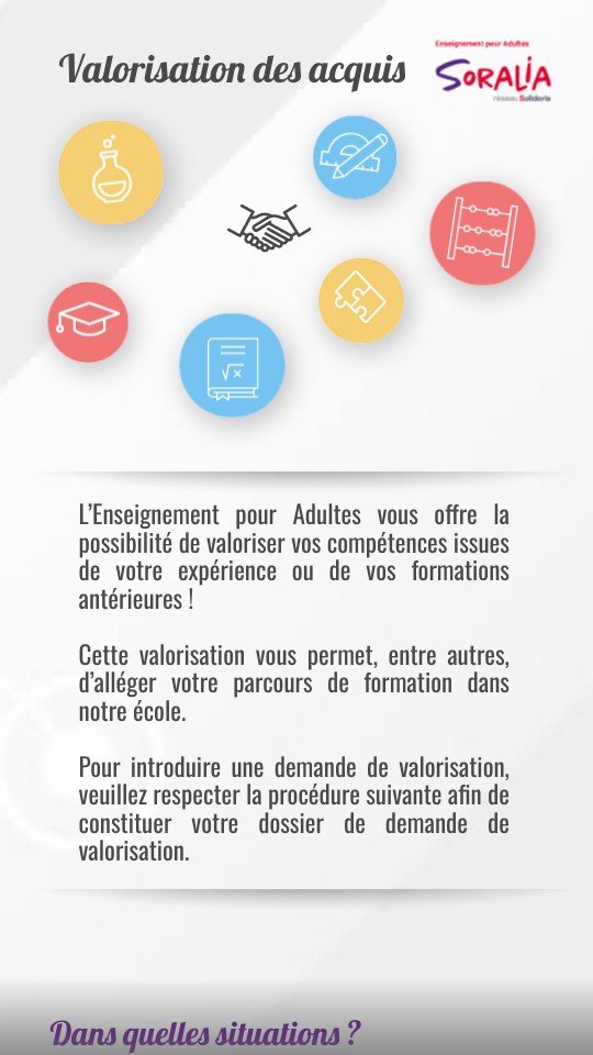 L’Enseignement pour Adultes vous offre la possibilité de valoriser vos compétences issues de votre expérience ou de vos formations antérieures ! Cette valorisation vous permet, entre autres, d’alléger votre parcours de formation dans notre école. Pour introduire une demande de valorisation, veuillez respecter la procédure suivante afin de constituer votre dossier de demande de valorisation.