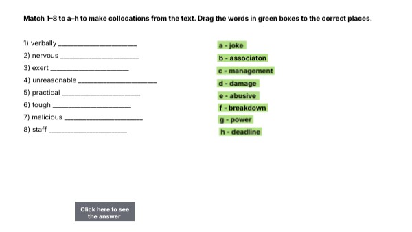 Match 1–8 to a–h to make collocations from the text. Drag the words in green boxes to the correct places. 1) verbally _________________________ 2) nervous _________________________ 3) exert _________________________ 4) unreasonable _________________________ 5) practical _________________________ 6) tough _________________________ 7) malicious _________________________ 8) staff _________________________