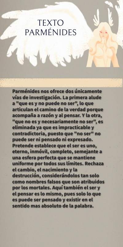Parménides nos ofrece dos únicamente vías de investigación. La primera alude a "que es y no puede no ser", lo que articulan el camino de la verdad porque acompaña a razón y al pensar. Y la otra, "que no es y necesariamente no ser", es eliminada ya que es impracticable y contradictoria, puesto que "no ser" no puede ser ni pensado ni expresado. Pretende establece que el ser es uno, eterno, inmóvil, completo, semejante a una esfera perfecta que se mantiene uniforme por todos sus límites. Rechaza el cambio, el nacimiento y la destrucción, considerándolos tan solo como nombres falsos que son atribuidos por los mortales. Aquí también el ser y el pensar es lo mismo, pues solo lo que es puede ser pensado y existir en el sentido mas absoluto de la palabra.