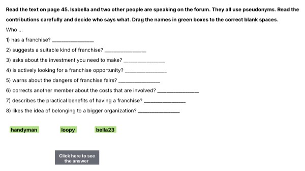 Read the text on page 45. Isabella and two other people are speaking on the forum. They all use pseudonyms. Read the contributions carefully and decide who says what. Drag the names in green boxes to the correct blank spaces. Who … 1) has a franchise? __________________ 2) suggests a suitable kind of franchise? __________________ 3) asks about the investment you need to make? __________________ 4) is actively looking for a franchise opportunity? __________________ 5) warns about the dangers of franchise fairs? __________________ 6) corrects another member about the costs that are involved? __________________ 7) describes the practical benefits of having a franchise? __________________ 8) likes the idea of belonging to a bigger organization? __________________
