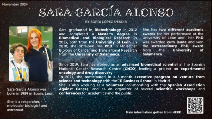 Sara García Alonso was born in 1989 in Spain, León. She is a researcher, molecular biologist and astronaut.