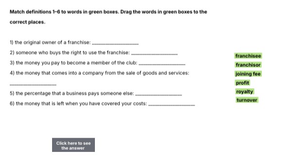 Match definitions 1–6 to words in green boxes. Drag the words in green boxes to the correct places. 1) the original owner of a franchise: _____________________ 2) someone who buys the right to use the franchise: _____________________ 3) the money you pay to become a member of the club: _____________________ 4) the money that comes into a company from the sale of goods and services: _____________________ 5) the percentage that a business pays someone else: _____________________ 6) the money that is left when you have covered your costs: _____________________