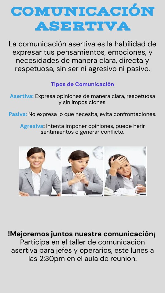 !Mejoremos juntos nuestra comunicación¡ Participa en el taller de comunicación asertiva para jefes y operarios, este lunes a las 2:30pm en el aula de reunion.