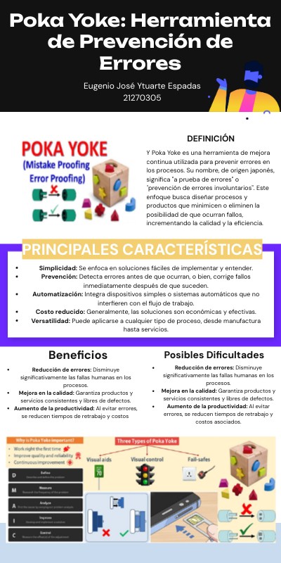 Y Poka Yoke es una herramienta de mejora continua utilizada para prevenir errores en los procesos. Su nombre, de origen japonés, significa "a prueba de errores" o "prevención de errores involuntarios". Este enfoque busca diseñar procesos y productos que minimicen o eliminen la posibilidad de que ocurran fallos, incrementando la calidad y la eficiencia.
