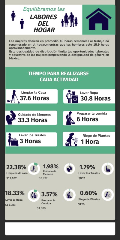 Las mujeres dedican en promedio 40 horas semanales al trabajo no renumerado en el hogar,mientras que los hombres solo 15.9 horas aproximadamente. Esta desigualdad de distribución limita las oportunidades laborales y educativa de las mujeres,perpetuando la desigualdad de género en México.