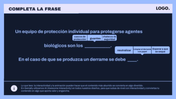 Lo que lees: la interactividad y la animación pueden hacer que el contenido más aburrido se convierta en algo divertido. En Genially utilizamos AI (Awesome Interactivity) en todos nuestros diseños, para que subas de nivel con interactividad y conviertas tu contenido en algo que aporta valor y engancha.