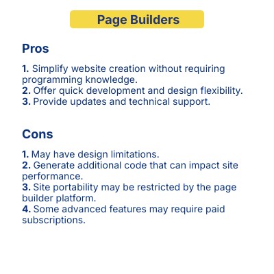 1. May have design limitations. 2. Generate additional code that can impact site performance. 3. Site portability may be restricted by the page builder platform. 4. Some advanced features may require paid subscriptions.