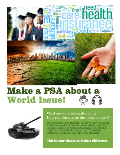 You will research a world issue that you are very interested in and decide how you will showcase that issue in a visually appealing video that is only 60-90 seconds long. Think how you can gain people’s attention and make them act. You PSA should be professional looking and rock solid in terms of research.