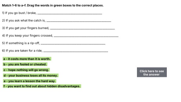 Match 1–6 to a–f. Drag the words in green boxes to the correct places. 1) If you go bust / broke, _______________________________________________ 2) If you ask what the catch is, _______________________________________________ 3) If you get your fingers burned, _______________________________________________ 4) If you keep your fingers crossed, _______________________________________________ 5) If something is a rip-off, _______________________________________________ 6) If you are taken for a ride, _______________________________________________
