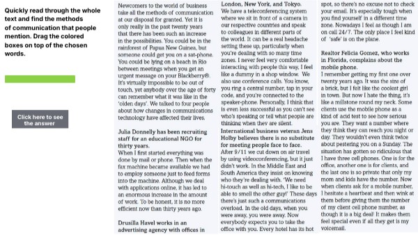 Quickly read through the whole text and find the methods of communication that people mention. Drag the colored boxes on top of the chosen words.