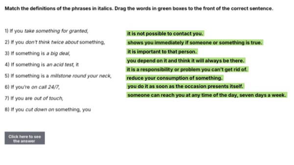 Match the definitions of the phrases in italics. Drag the words in green boxes to the front of the correct sentence. 1) If you take something for granted, 2) If you don’t think twice about something, 3) If something is a big deal, 4) If something is an acid test, it 5) If something is a millstone round your neck, 6) If you’re on call 24/7, 7) If you are out of touch, 8) If you cut down on something, you