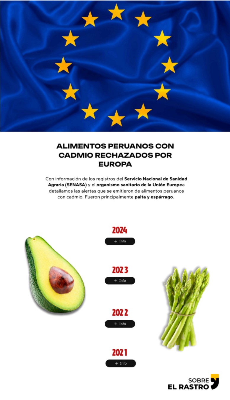 Con información de los registros del Servicio Nacional de Sanidad Agraria (SENASA) y el organismo sanitario de la Unión Europea detallamos las alertas que se emitieron de alimentos peruanos con cadmio. Fueron principalmente palta y espárrago.