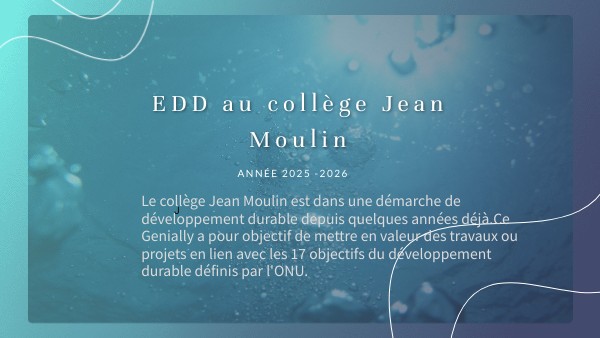 Le collège Jean Moulin est dans une démarche de développement durable depuis quelques années déjà.Ce Genially a pour objectif de mettre en valeur des travaux ou projets en lien avec les 17 objectifs du développement durable définis par l'ONU.