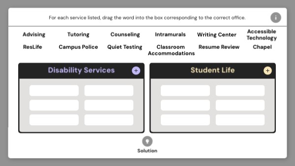 Advising; Tutoring; Writing Center; Accessible Technology; Quiet Testing; Classroom Accommodations