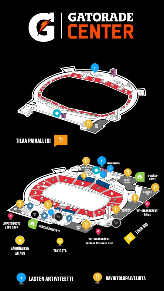 Voit tilata ruokaa, juomaa ja fanituotteita suoraan istuimellesi. Sovelluksen lataaminen on ilmaista, eikä tilatuista tuotteista veloiteta lisähintaa. Lataa TPS- tai Gatorade-sovellus matkapuhelimeesi App Storesta tai Google Play Kaupasta. Applikaation kautta voit tilata tuotteita kaikkiin katsomonosiin - katsomoravintolaan, yläkatsomoon ja jopa aitioihin.