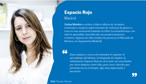 Carina Moreira es artista y lidera talleres de cerámica orientados a mujeres supervivientes de violencia de género y trata en esta asociación fundada en 2004. Las beneficiarias, con todo lo aprendido, han liderado sus propios proyectos creativos. Algunas de ellas venden las piezas en el Mercado de Motores, en Arganzuela (Madrid).
