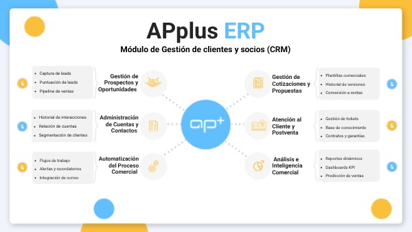 El módulo CRM en APplus-ERP centraliza la gestión de relaciones con clientes, facilitando el seguimiento de interacciones, oportunidades y la personalización de servicios para mejorar la satisfacción y lealtad del cliente. Esta funcionalidad permite al equipo comercial y de soporte optimizar la atención al cliente y anticiparse a sus necesidades, impulsando así el crecimiento y la retención de la base de clientes.