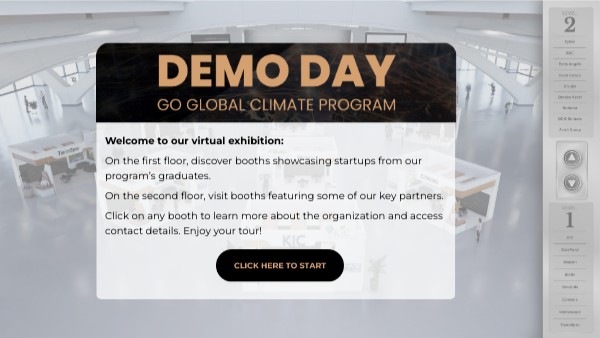 Welcome to our virtual exhibition: On the first floor, discover booths showcasing startups from our program’s graduates. On the second floor, visit booths featuring some of our key partners. Click on any booth to learn more about the organization and access contact details. Enjoy your tour!