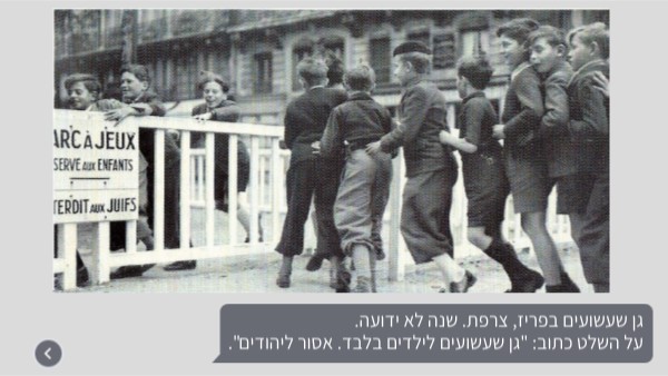 גן שעשועים בפריז, צרפת. שנה לא ידועה. על השלט כתוב: "גן שעשועים לילדים בלבד. אסור ליהודים".