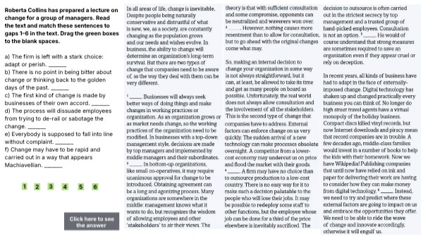 Roberta Collins has prepared a lecture on change for a group of managers. Read the text and match these sentences to gaps 1–6 in the text. Drag the green boxes to the blank spaces. a) The firm is left with a stark choice: adapt or perish. _______ b) There is no point in being bitter about change or thinking back to the golden days of the past. _______ c) The first kind of change is made by businesses of their own accord. _______ d) The process will dissuade employees from trying to de-rail or sabotage the change. _______ e) Everybody is supposed to fall into line without complaint. _______ f) Change may have to be rapid and carried out in a way that appears Machiavellian. _______