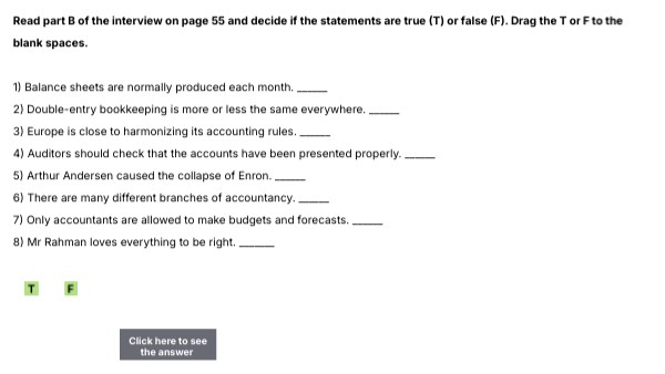 Read part B of the interview on page 55 and decide if the statements are true (T) or false (F). Drag the T or F to the blank spaces. 1) Balance sheets are normally produced each month. ______ 2) Double-entry bookkeeping is more or less the same everywhere. ______ 3) Europe is close to harmonizing its accounting rules. ______ 4) Auditors should check that the accounts have been presented properly. ______ 5) Arthur Andersen caused the collapse of Enron. ______ 6) There are many different branches of accountancy. ______ 7) Only accountants are allowed to make budgets and forecasts. ______ 8) Mr Rahman loves everything to be right. _______