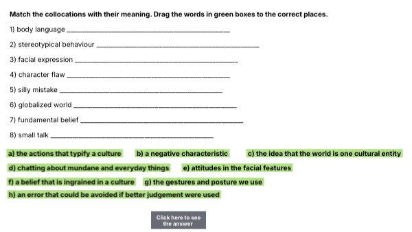 Match the collocations with their meaning. Drag the words in green boxes to the correct places. 1) body language ____________________________________________________ 2) stereotypical behaviour ____________________________________________________ 3) facial expression ____________________________________________________ 4) character flaw ____________________________________________________ 5) silly mistake ____________________________________________________ 6) globalized world ____________________________________________________ 7) fundamental belief ____________________________________________________ 8) small talk ____________________________________________________