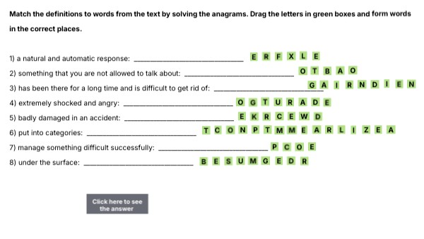Match the definitions to words from the text by solving the anagrams. Drag the letters in green boxes and form words in the correct places. 1) a natural and automatic response: __________________________________ 2) something that you are not allowed to talk about: __________________________________ 3) has been there for a long time and is difficult to get rid of: __________________________________ 4) extremely shocked and angry: __________________________________ 5) badly damaged in an accident: __________________________________ 6) put into categories: __________________________________ 7) manage something difficult successfully: __________________________________ 8) under the surface: __________________________________